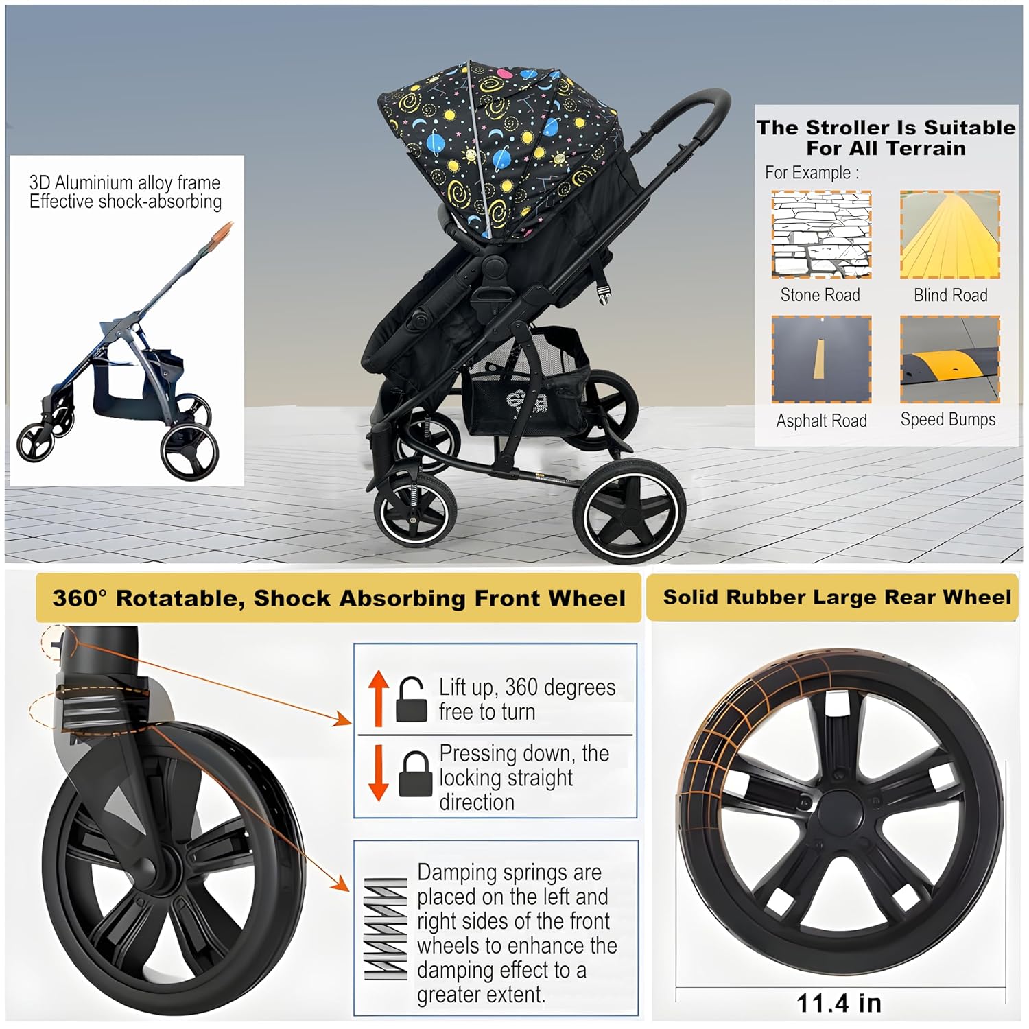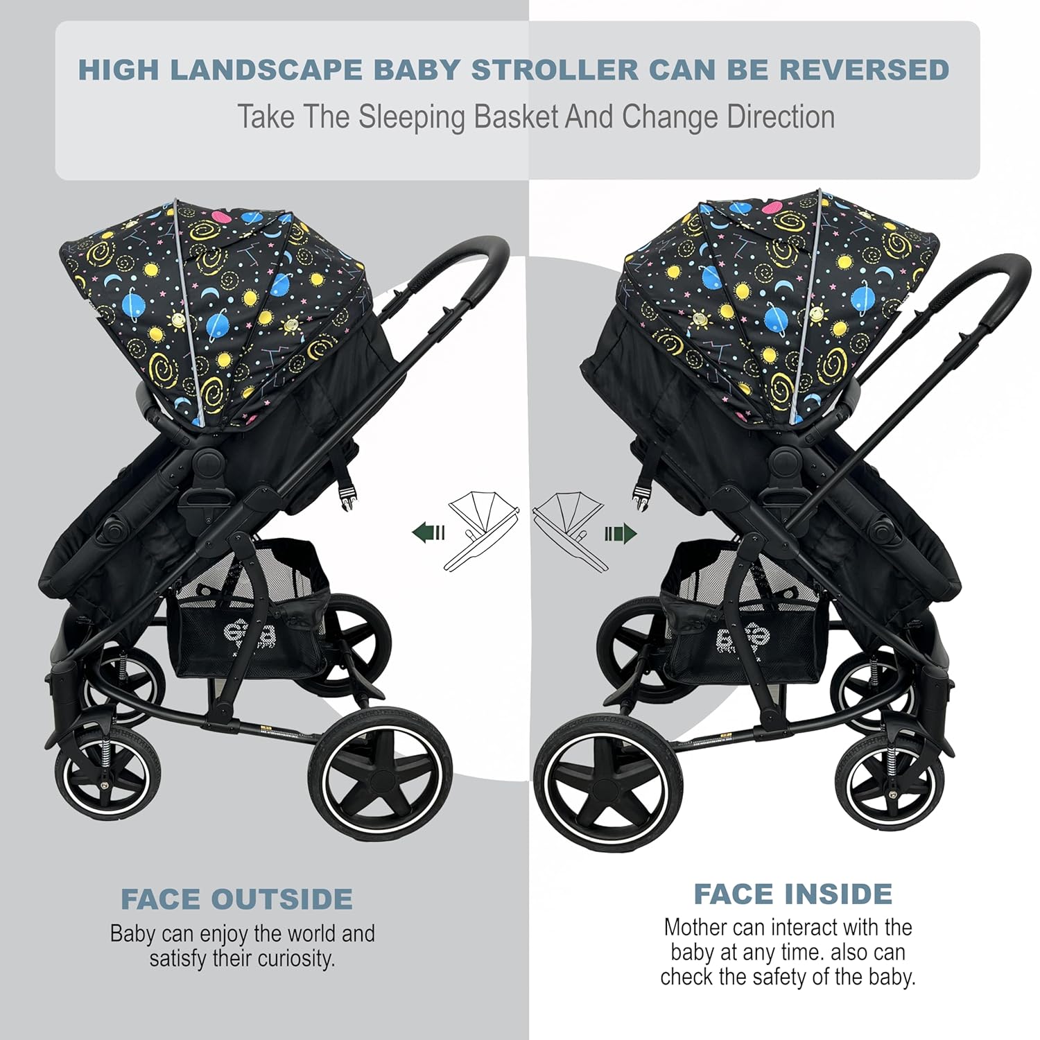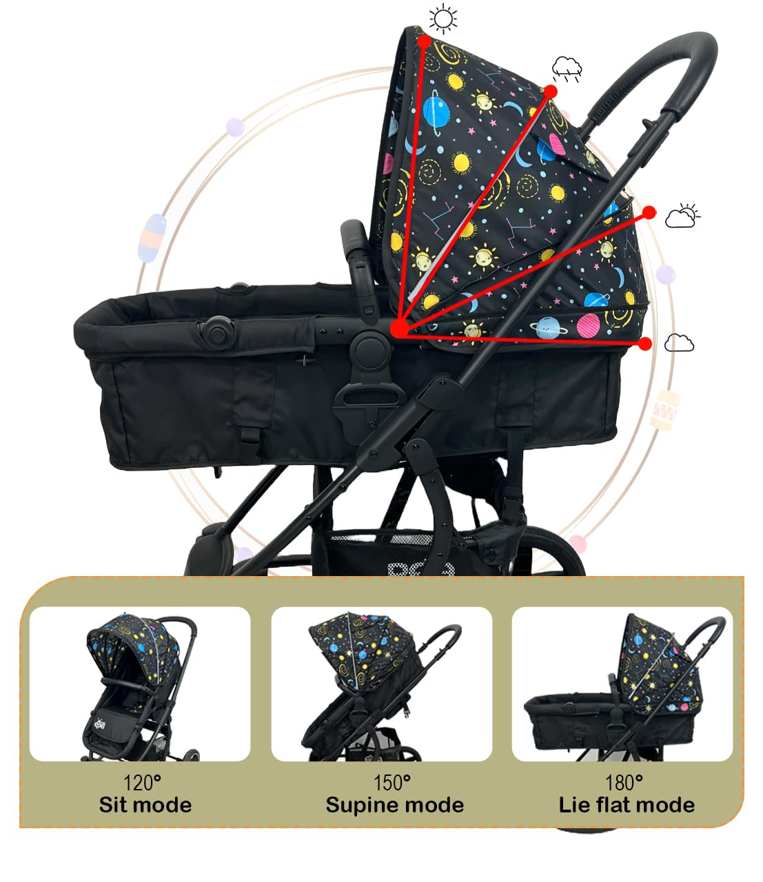 • 2-IN-1 TRANSFORMABLE SEAT: Baby stroller for 0-3 years Experience unparalleled versatility with a unique dual-purpose seat design that seamlessly transitions between a cozy sitting position and a convenient carry cot. This adaptability allows you to cater to your baby’s changing needs, ensuring a comfortable and enjoyable journey for both of you.